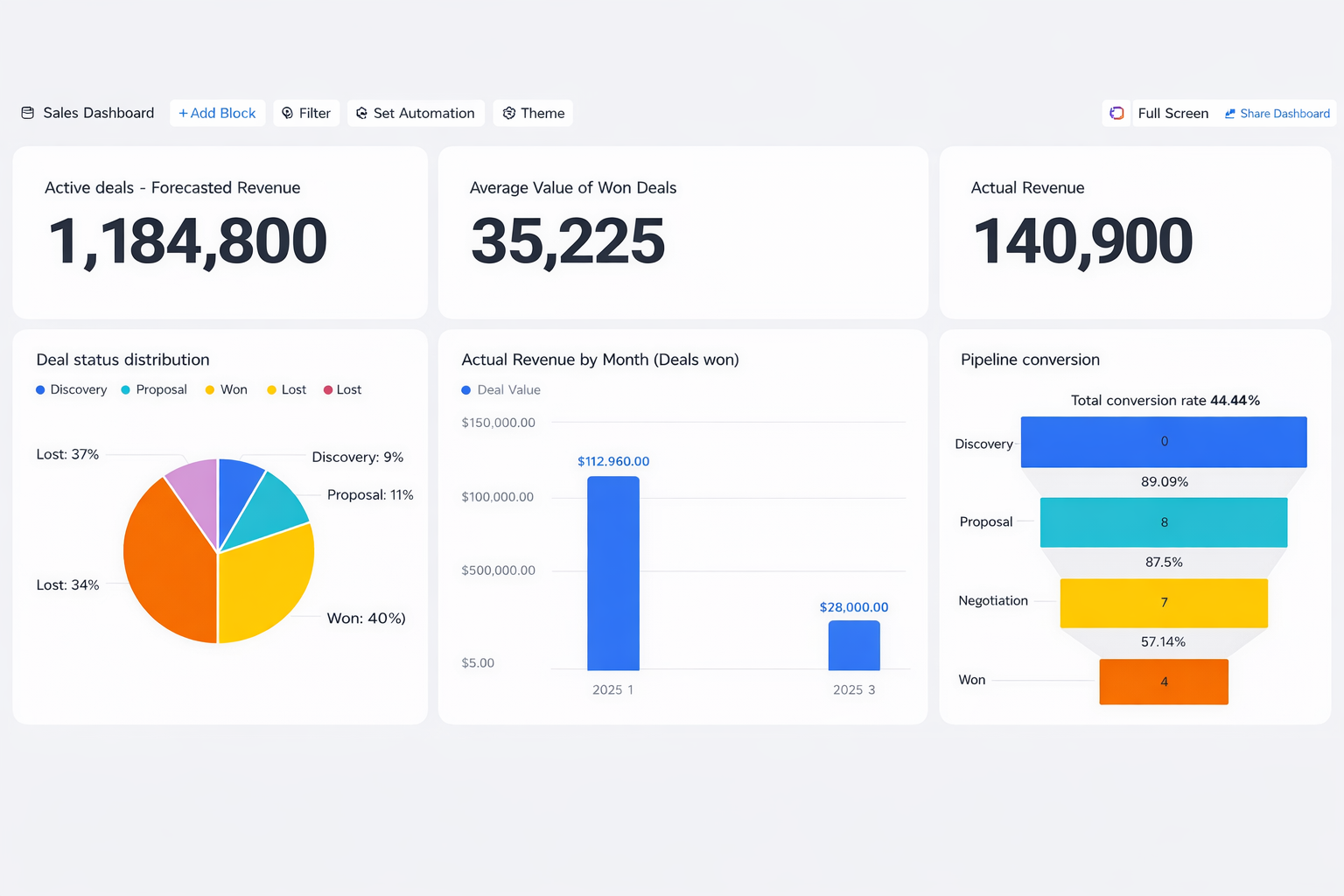 Ideal untuk tim yang membutuhkan sistem terstruktur namun ringan. Template ini membantu mengatur informasi klien, melacak peluang, dan mengelola kontrak. Dengan Kanban view untuk segmentasi pelanggan dan sales cockpit untuk update real time, template ini menjaga data pelanggan tetap akurat dan mudah ditindaklanjuti tanpa kompleksitas berlebihan.
